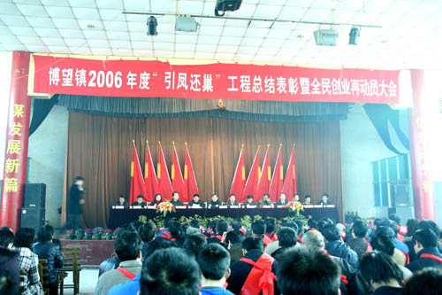 2007年2月26日上午9時,博望鎮2006年度“引鳳還巢”工程總結表彰和全民創業再動員大會在博望文體中心隆重舉行,當涂縣縣長操隆山、縣委常委、博望鎮黨委書記張清、鎮長劉國寶等出席了大會并作了重要講話。會議對2006年度“引鳳還巢”和全民創業兩大工程中涌現出的各類先進集體、先進個人予以了表彰并對2007年的工作進行了全部的部署。