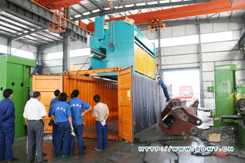 這套大型機(jī)床主機(jī)由兩臺(tái)250噸6米的數(shù)控板料折彎?rùn)C(jī)組成,可實(shí)現(xiàn)單機(jī)及雙機(jī)聯(lián)動(dòng)工作的功能,極大的方便了大型生產(chǎn)中的多元化要求。機(jī)器總重達(dá)50余噸,可完成12米的工件,對(duì)裝箱的操作技術(shù)要求很高,但由于我們機(jī)械化的車(chē)間及熟練的技術(shù)人員,裝箱過(guò)程雖然繁瑣但并不費(fèi)力。由于整機(jī)超高超長(zhǎng),采用的是兩個(gè)開(kāi)頂箱,將兩臺(tái)主機(jī)分開(kāi)來(lái)裝??紤]到機(jī)器要在海上航行近一個(gè)月,裝箱的工作人員做足了防護(hù)措施:底部鋼條固定,兩側(cè)鐵絲固定,外加透明塑料膜,頂部自制框架固定并套上雨布等等,以免在運(yùn)輸過(guò)程中造成對(duì)機(jī)器不必要的損壞。