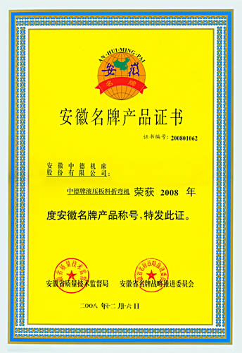 中德牌液壓板料折彎?rùn)C(jī)喜獲2008年“安徽省名牌產(chǎn)品”的殊榮,這是繼2005年中德牌液壓擺式剪板機(jī)獲“安徽名牌產(chǎn)品”之后,中德機(jī)床的質(zhì)量和信譽(yù)又一次獲得認(rèn)可。與此同時(shí),中德牌液壓擺式剪板機(jī)也順利通過安徽名牌產(chǎn)品的復(fù)審,證書的有效期將延長(zhǎng)至2013年。